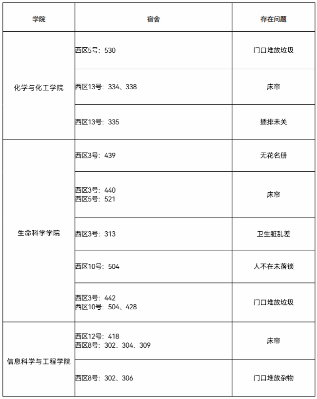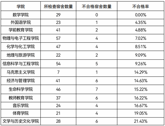 在本周学生宿舍集中大检查中,学生管理中心按照《齐鲁师范学院学生公寓管理规定》《齐鲁师范学院学生公寓卫生管理标准实施细则》等文件要求,对章丘校区477间宿舍进行检查,评出不合格宿舍52间。