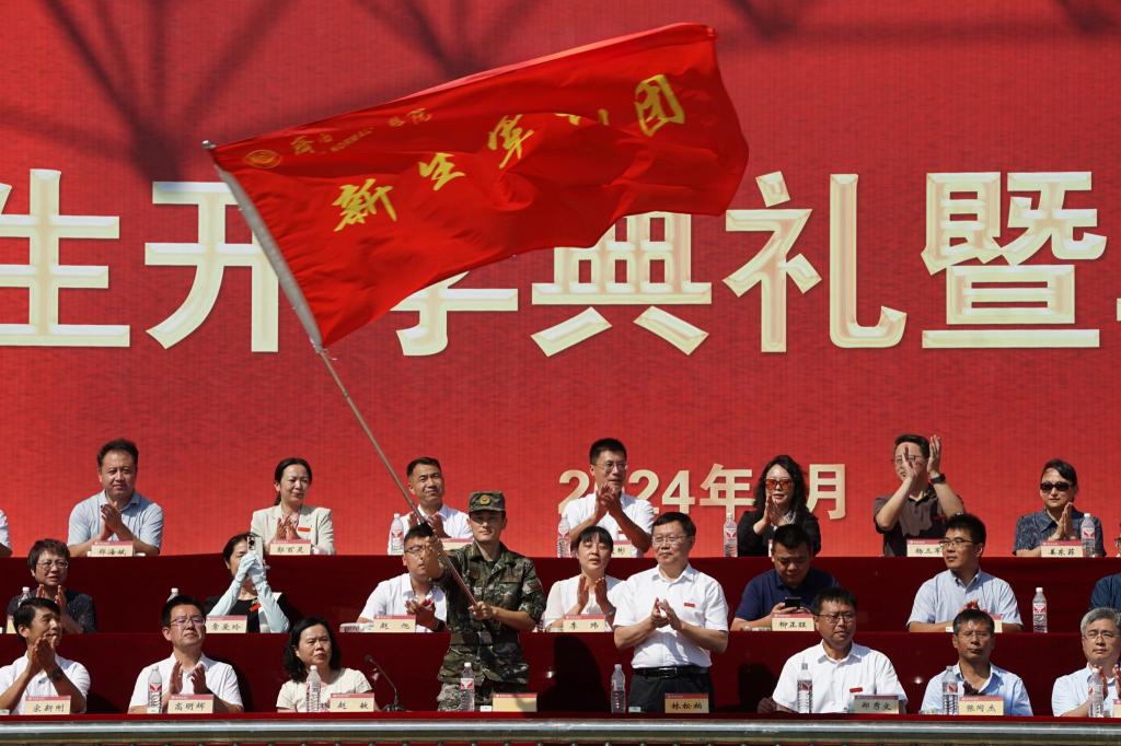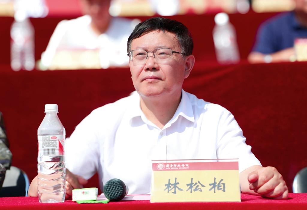 林松柏宣布2024级新生军训开训,并向2024级新生军训团授旗。