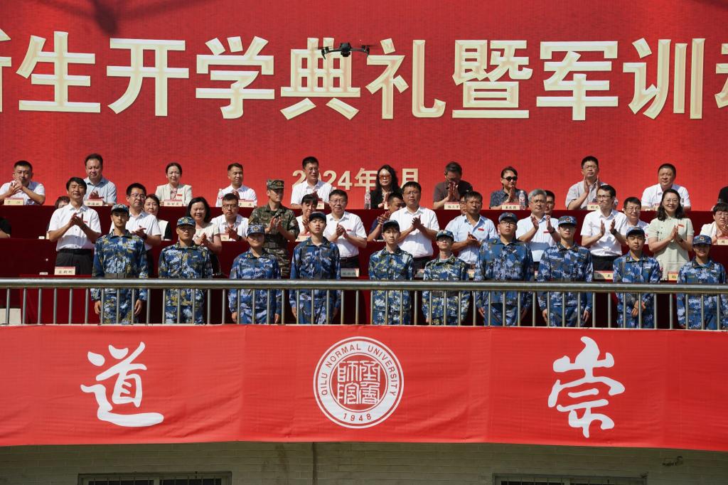 9月9日上午,齐鲁师范学院2024级新生开学典礼暨军训动员大会在章丘校区体育场举行。学校党委书记林松柏,党委副书记、校长郑秀文,党委副书记赵敏,副校长张兆明,党委委员、纪委书记、监察专员高明辉,党委委员、副校长孙正,党委委员、统战部部长宋新刚,党委委员、宣传部部长孙磊,杰出校友代表,承训部队相关人员出席典礼。典礼由赵敏主持。学校相关部门负责人,各学院院长、党委书记(副书记),学生工作部(处)、团委全体工作人员,各学院团总支书记(副书记)、辅导员,2024级全体新生共同观礼。