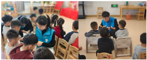 活动以铸魂育人为根本目标,以先锋服务为实践路径,构建“党员带头、团员跟进、党团协同”的联动格局,推动党建带团建工作走深走实。学院党员亮明身份、主动担当,带领团员将数学专业优势与红色教育、志愿服务深度融合,围绕雷锋精神传承、红色故事宣讲、爱国情怀培育等内容,精心设计趣味课堂、互动辅导、红色歌曲传唱等环节,既为幼儿园孩子们带来生动有趣的学习体验,也在实践教学中锤炼教学技能、提升沟通表达能力,实现志愿服务践初心与专业能力强本领的双向提升。