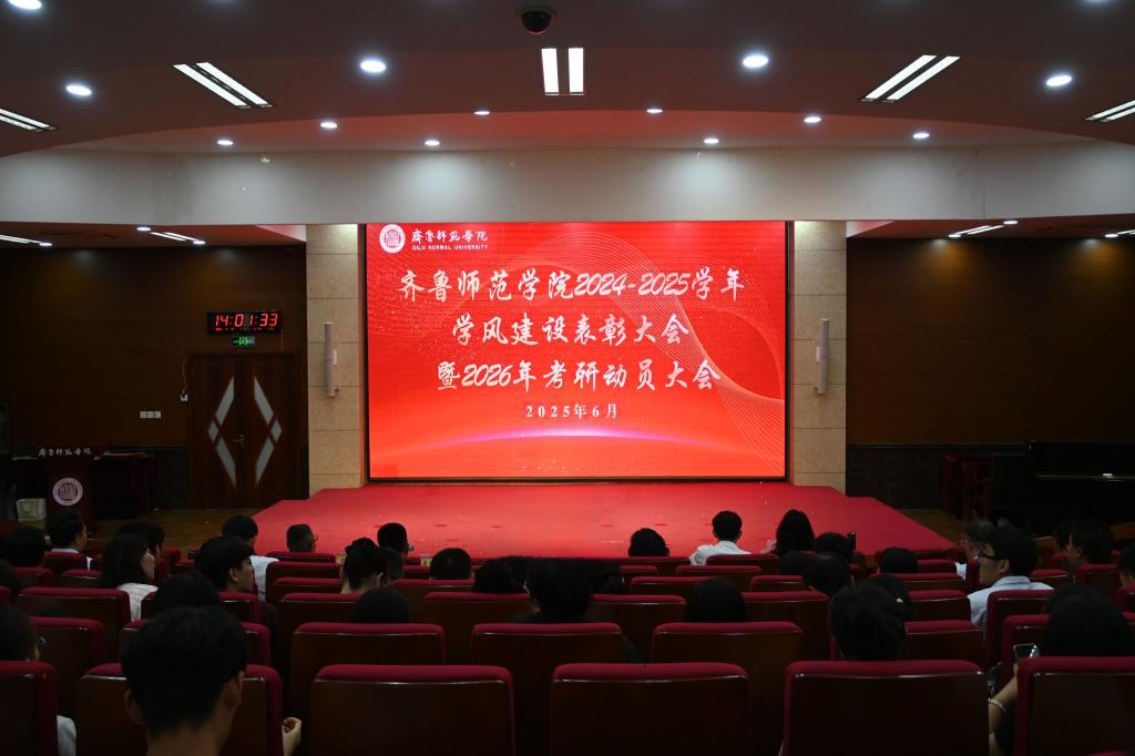 为落实立德树人根本任务,促进学校优良学风建设,激励和引领广大师生向优秀榜样学习,6月19日下午,学校在章丘校区第一学术报告厅举行2024-2025学年学风建设表彰大会暨2026年考研动员大会。学校党委副书记、校长郑秀文,党委副书记赵敏,党委委员、纪委书记、省监委驻齐鲁师范学院监察专员高明辉,党委委员、副校长孙正,党委委员、副校长孙洪兆,党委委员、宣传部部长孙磊出席活动。